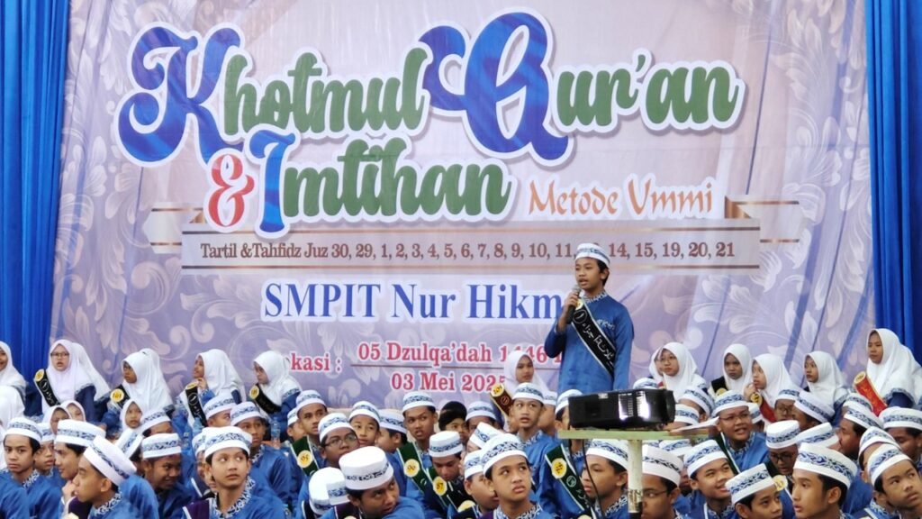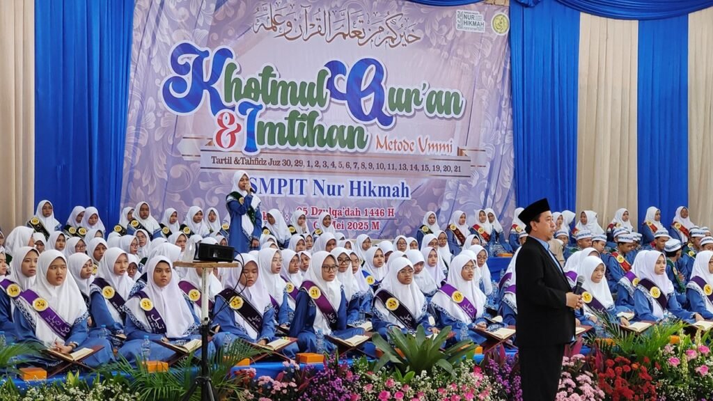 SMPIT Nur Hikmah, Bekasi, mengadakan Khotmul Quran dan Imtihan VI tahun 2025, Sabtu (3/5/2025). Kegiatan tersebut dilakukan secara kolosal dan dihadiri oleh seluruh peserta khotmul Quran, orang tua, serta tamu undangan dari berbagai kalangan, mulai dari Dinas Pendidikan Kota Bekasi, pimpinan pondok pesantren, hingga kepala sekolah sekitar Sekolah Nur Hikmah