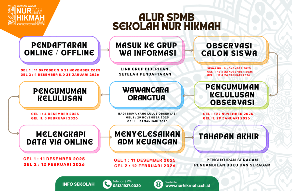 Sistem Penerimaan Murid baru ( SPMB ) untuk unit KB-TK, SDIT, SMPIT, dan SMAIT Nur Hikmah akan dilakukan serempak oleh panitia SPMB di tanggal 11 Oktober 2025. Meskipun pendaftaran dilakukan pada tanggal tersebut, kunjungan dan survey sekolah sudah kami buka.